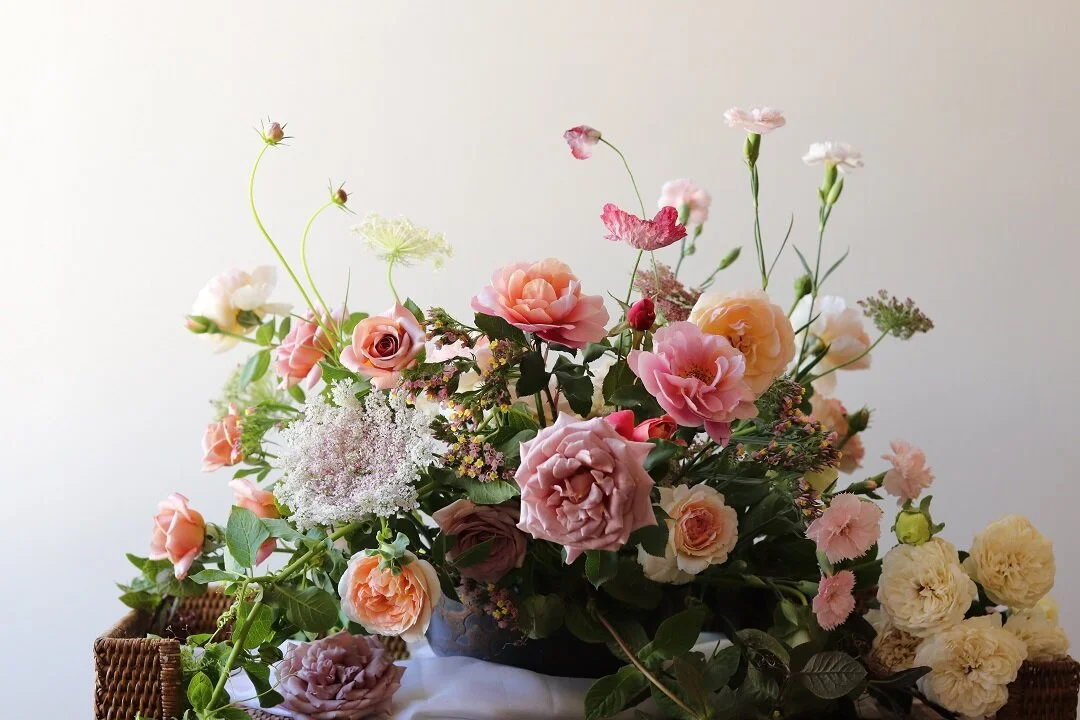 Pastel centerpiece of garden roses, sweet peas, cup and saucer, strawflower, foxglove, and Sicilian honey garlic.